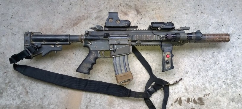 Hmm. The war torn generation 1 Redimag, the old style VTAC sling that I got off a Danish Jaeger and the vertical split ring that holds the light.