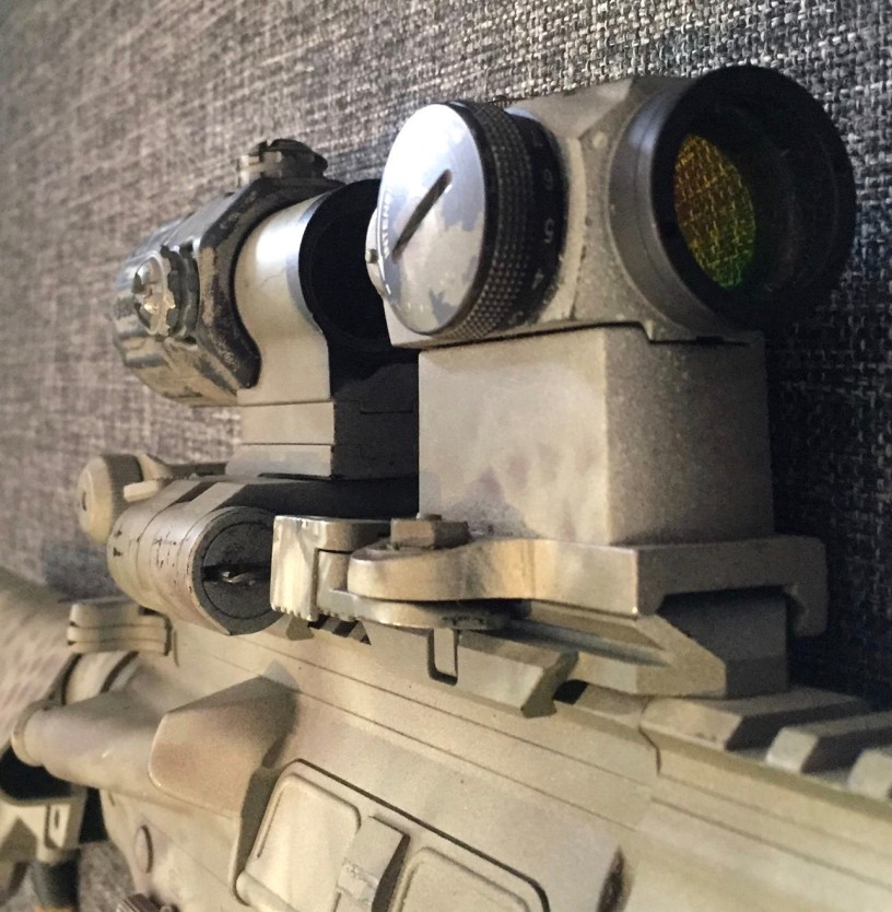While Wilcox’s riser is predesigned to suit an EOTech EXPS-model, EOTech G23/G33 and rear BUIS, it works flawlessly with other optics – like the Aimpoint Micro T1. You also get a little riser for your front BUIS, since the rear BUIS is a little higher when mounted on the Wilcox mount.