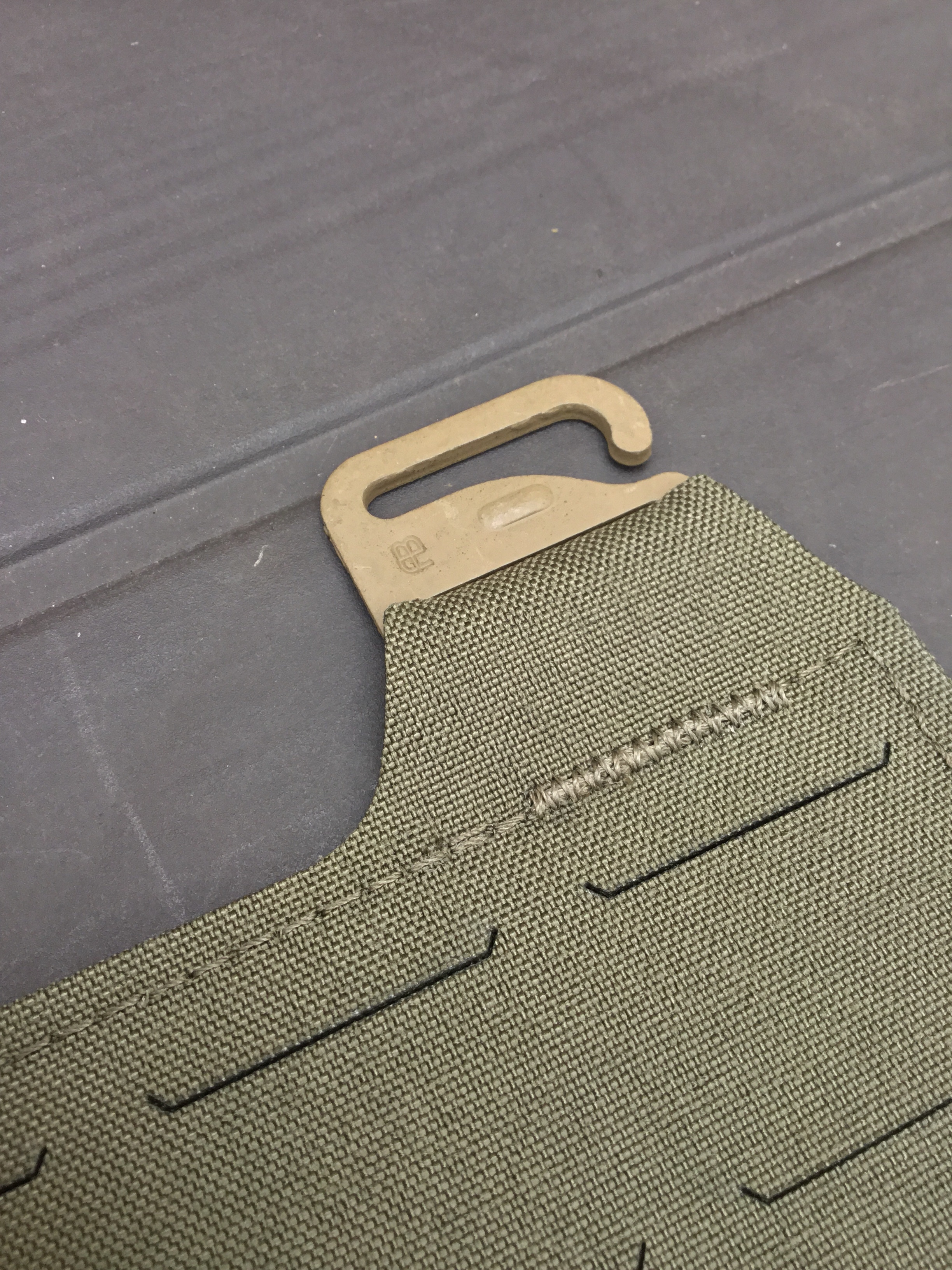 The top corners exhibit high quality metal G-hooks. These will be used, along with the panel’s hook Velcro, to secure the item to the rig. The hooks also provide redundant retention for the H-harness.