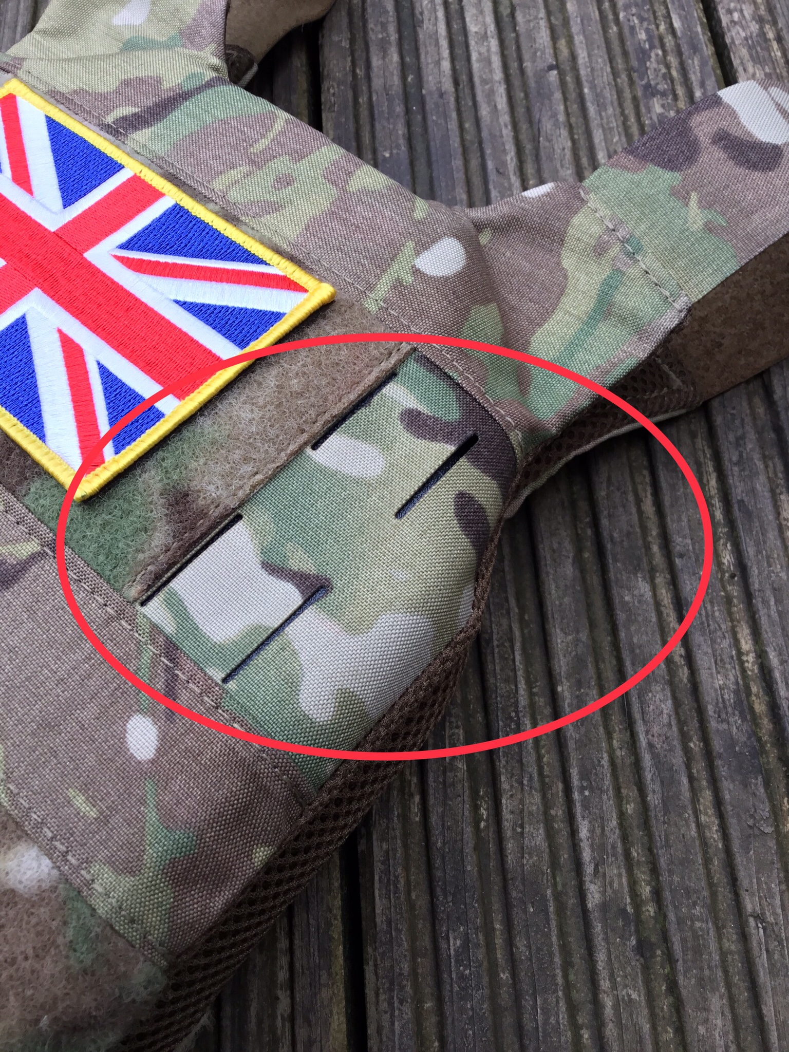 Of the few details on the front of the carrier, there are laser cut PALS slots on either side of the bib’s loop Velcro. These are orientated at 90 degrees to the horizontal. They can be used to affix the ITW QASM clips that I mentioned earlier…