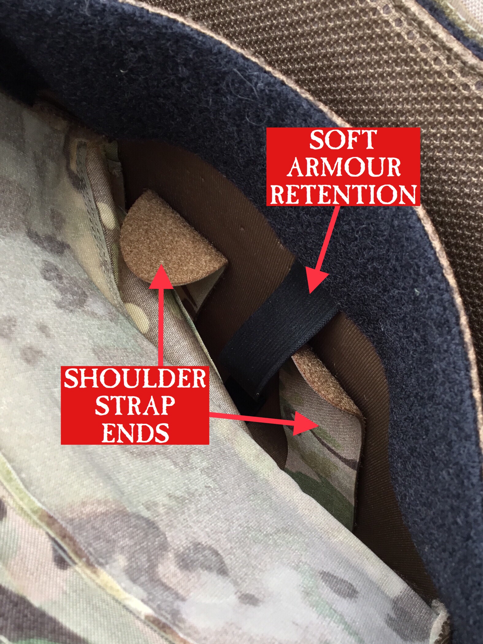 Inside each plate bag, there’s an elastic retainer for soft armour. The rear plate bag is also where the shoulder straps are adjusted.