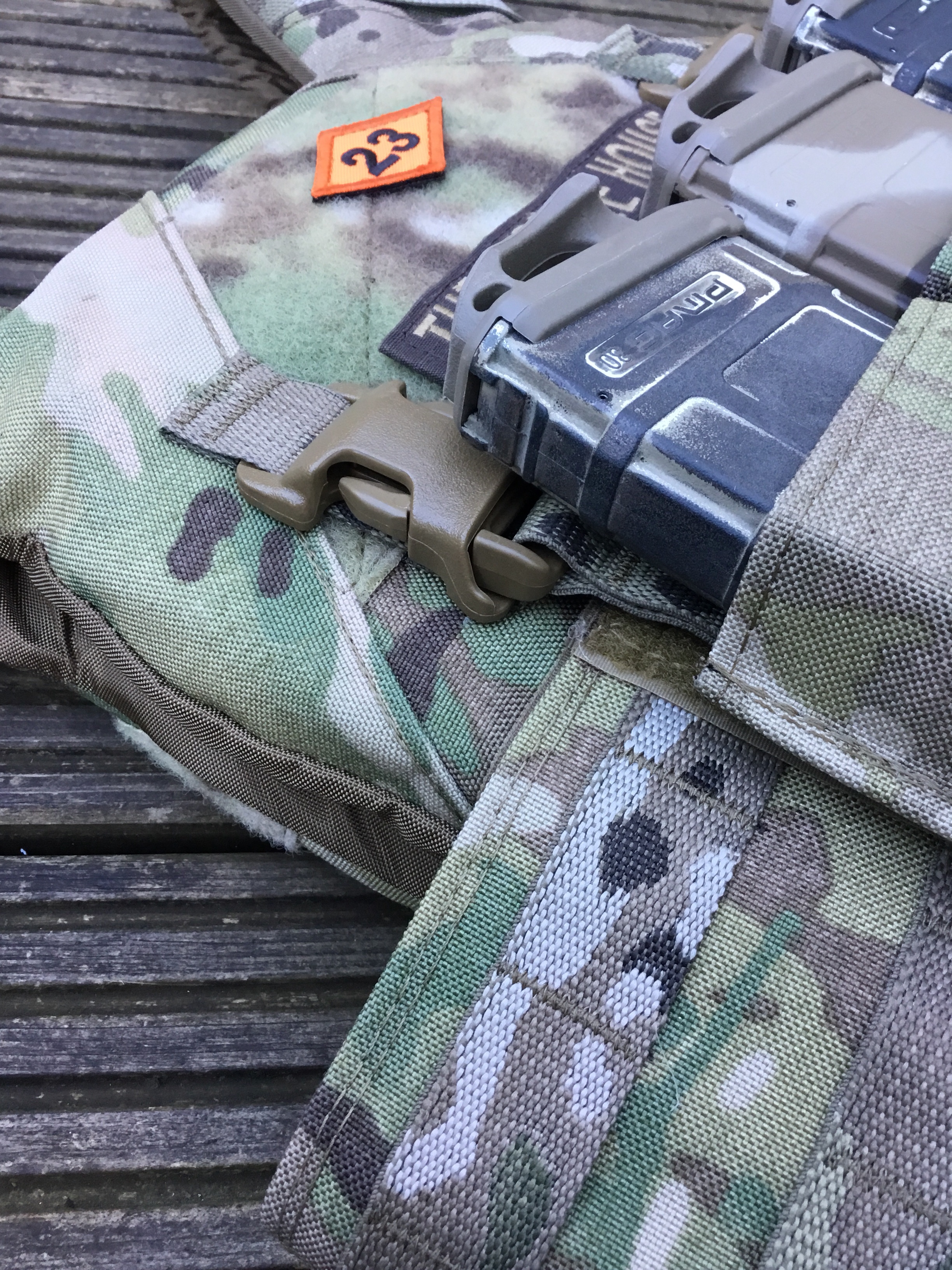 Jacquard webbing is used for PALS on the cummerbund and on the lower section of the rear plate bag. The angled daisy chains on the shoulder straps are also composed of this fabric.