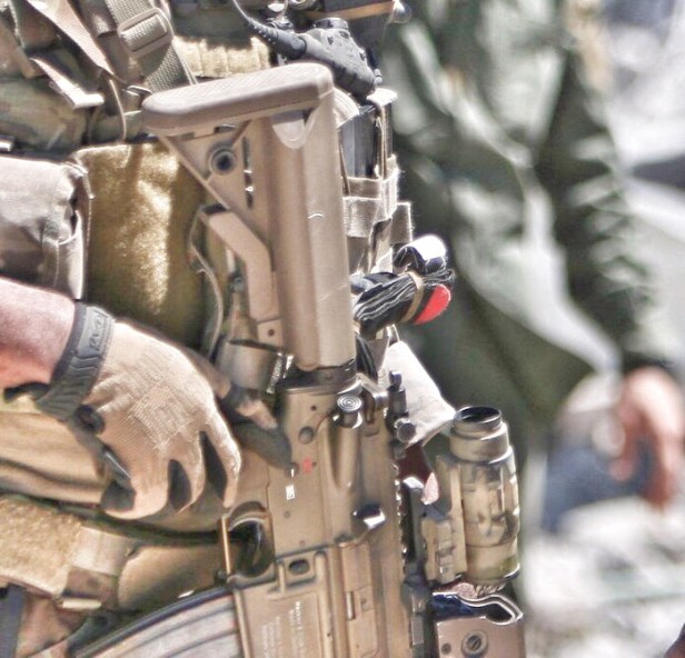 In the first pic, a black H&K fire selector is loud and clear. Unfortunately, this is the only pic I could find with a decent view of the left side of the gun. But, it is a really decent pic and shows a whole load of other details, too: