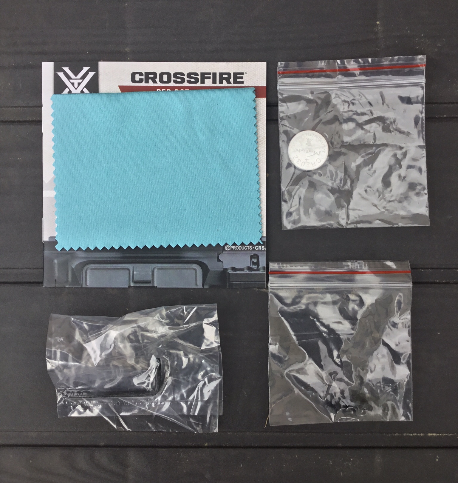 The Crossfire is attractively merchandised and bundled with a replaceable lower 1/3 co-witness mount, a low mount, Torx screws, Torx tool, bikini cover, CR2032 battery, lens cleaning cloth, and user manual