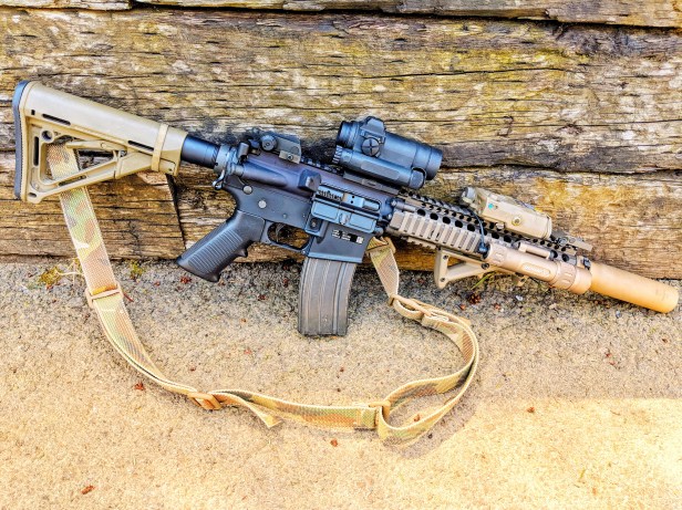I grabbed a Colt upper and BCG, slapped a PRI gas buster in it, and then paused. Instead of cutting down a Colt 11.5″ barrel I had, I opted instead for a Daniel Defense barrel, since they hold the contract.