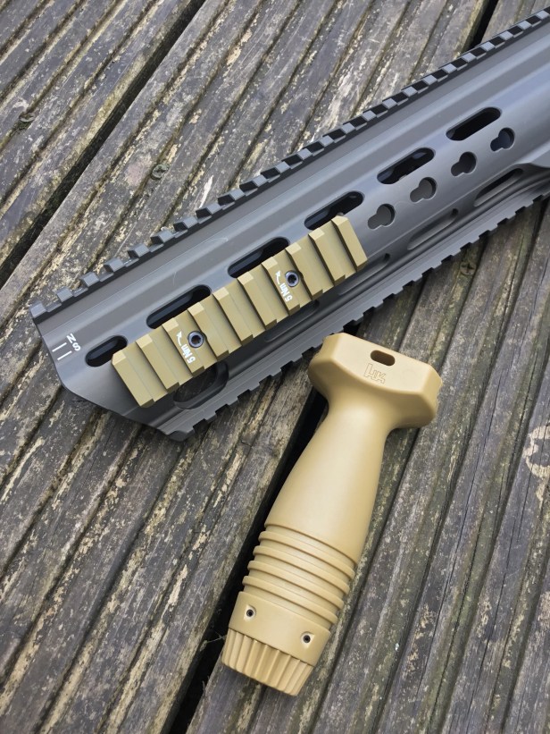 The Slim Line hand guard shown here is “RAL8000”, as are the HKey segments attached to it. The Assault Grip (reviewed here) is also RAL8000. None of the colours are true RAL8000, however, which is defined as a green-brown. Still, the HKey segments and the Assault Grip do match.