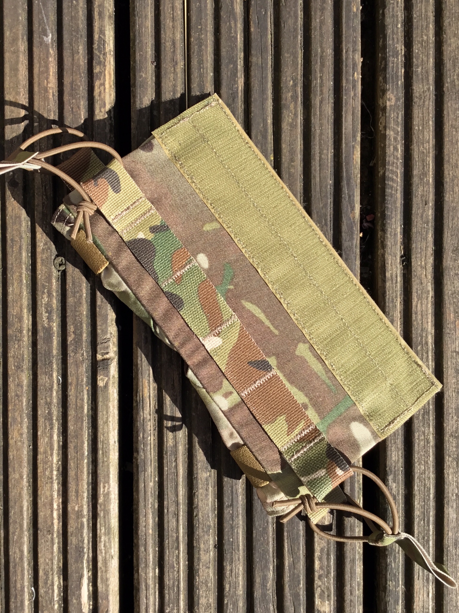 Interestingly, the pouch can be deployed at the rear of a PC or at the front. In both cases it attaches to the base of the plate bag, utilising the velcro mating surfaces therein. The pouch’s backer is stiffened, which prevents it moving as the user ambulates. It’s also slightly concave, so that when it’s applied to the curve of a plate, it doesn’t pucker. A clever touch.