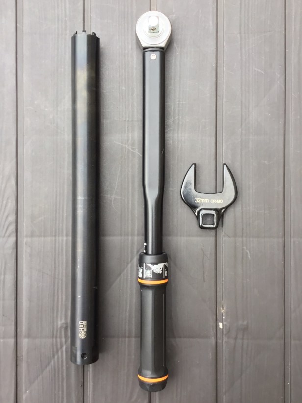 The crow’s foot attaches to the torque wrench’s 1/2″ drive and then to the flats at the end of HAO’s barrel nut tool. Alternatively you can insert a lever through the holes in the end of the barrel nut tool, for some torque.