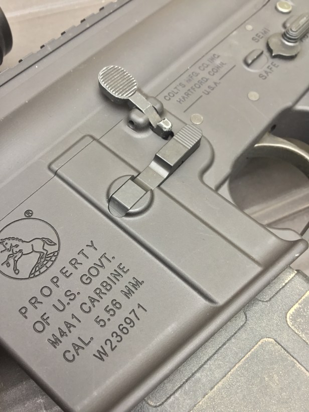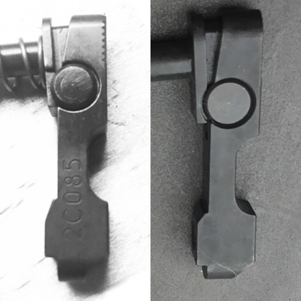 You can see the 2C085 trades and you know that because it’s Colt Canada, it will be of the highest quality. Also note the aggressive grip pattern on the catch face.
