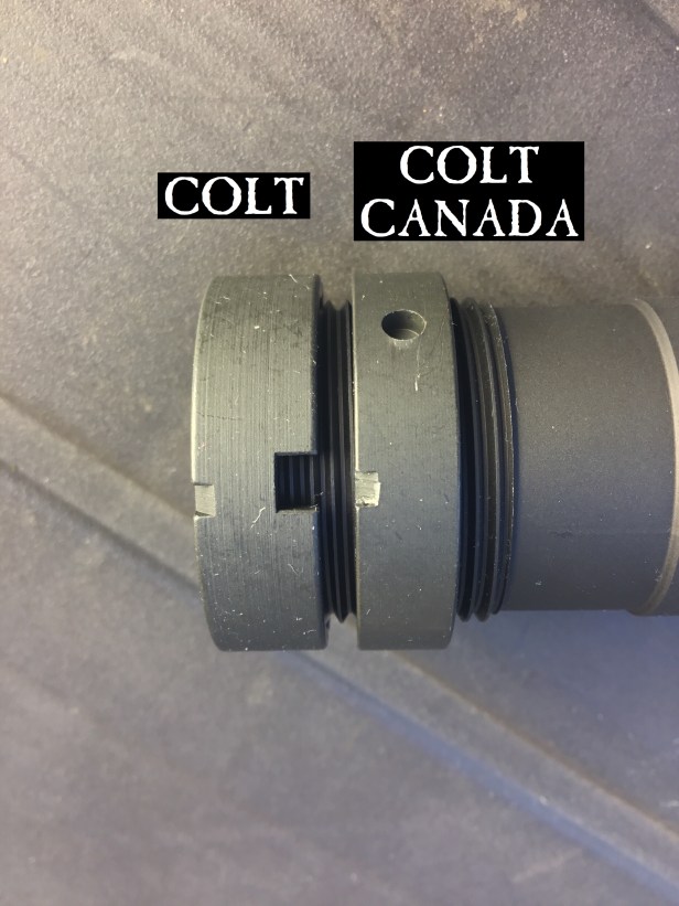 Below I’ll compare the Colt Canada parts to some from Colt USA that I’ve accumulated, plus other alternates. Don’t think of the Colt USA items as definitive, however. As far as I know they are not ‘Government’ AR items, just components that were easily available from Brownells UK.