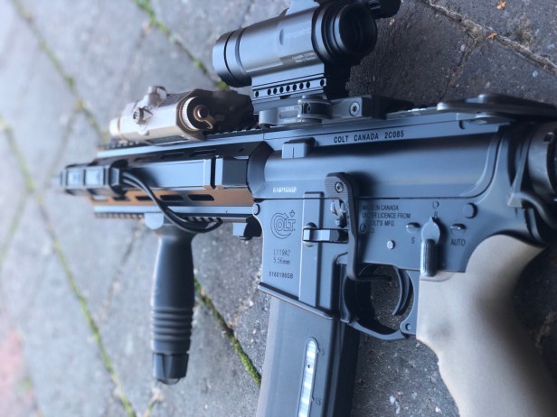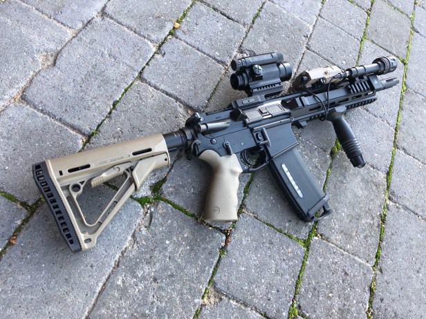It’s a newer and more ergonomic rifle, with the Ergo pistol grip, slick conjoined handguard and more modern pressure switches. It is a far more intuitive platform to use on the fly; plus it looks mean when kitted up and sprayed down.