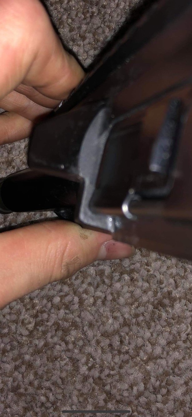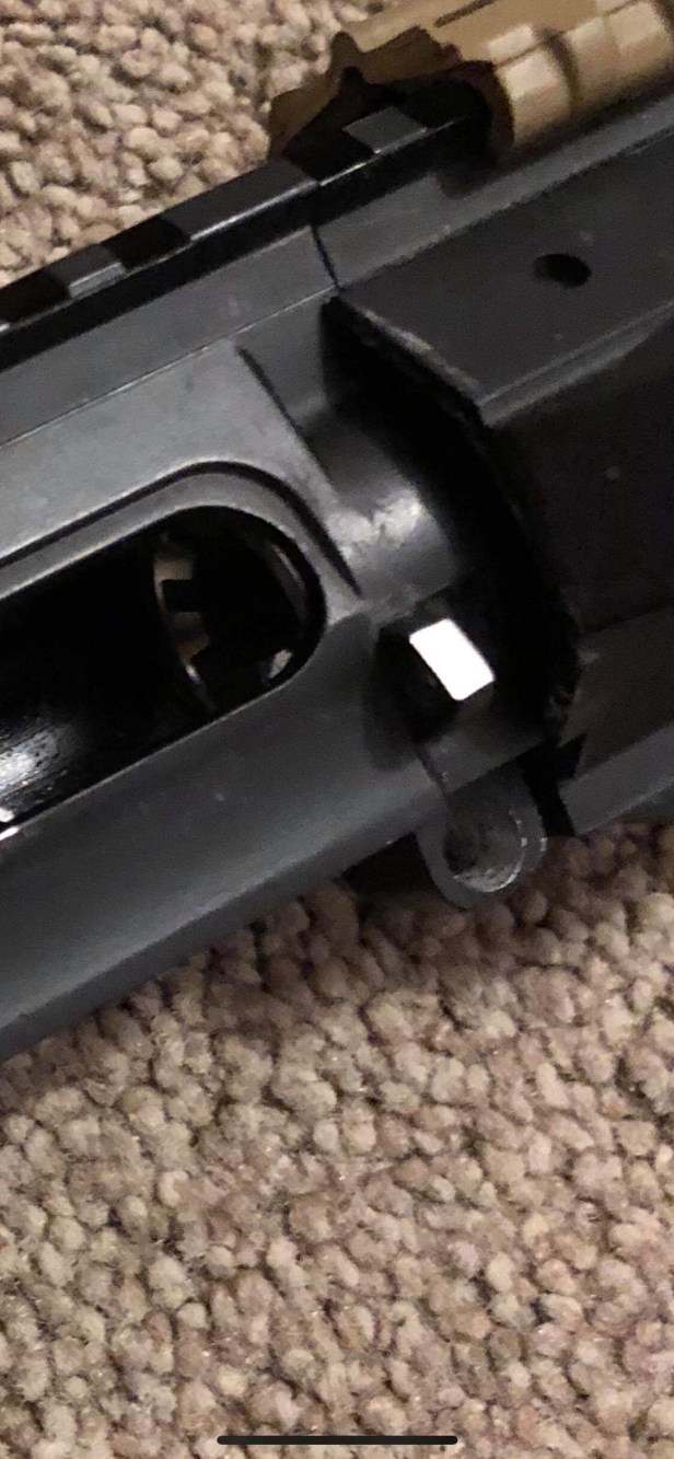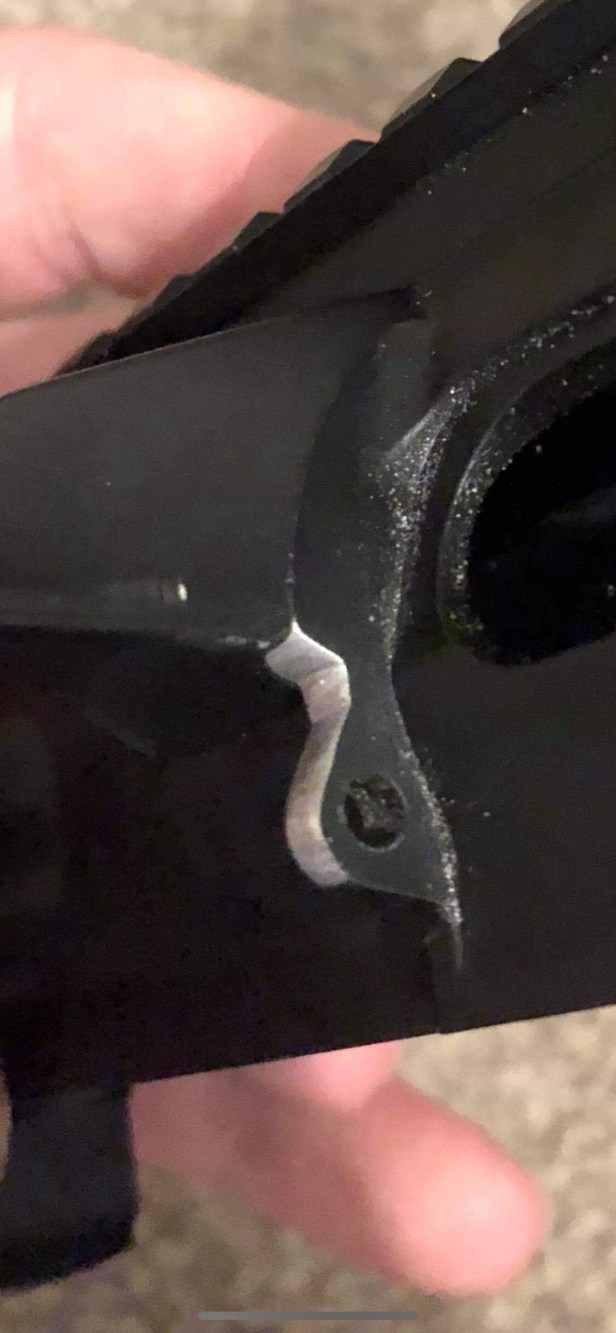Using a small hand file, or another abrasive tool, you will need to remove material from the rear dust cover pin hole to take the curve out of it, and create a right angle. This is done by following the line the brass deflector already exhibits, down towards the centre.