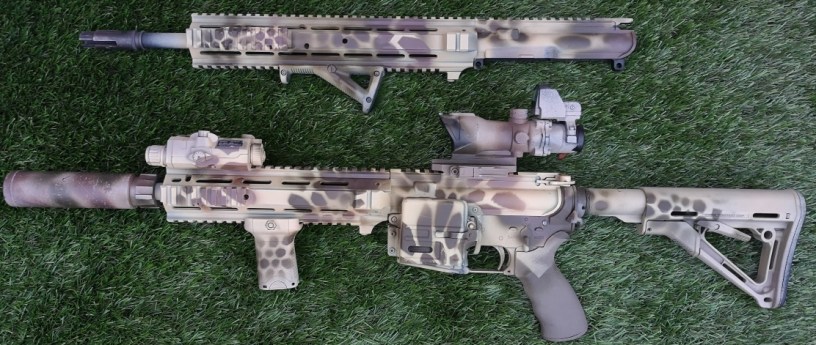 Having built the short upper more recently, I tried to line-up bits of the pattern with those on the lower receiver and yes! Obviously the big green blob at the back doesn’t play in my favour – but I’ll survive.