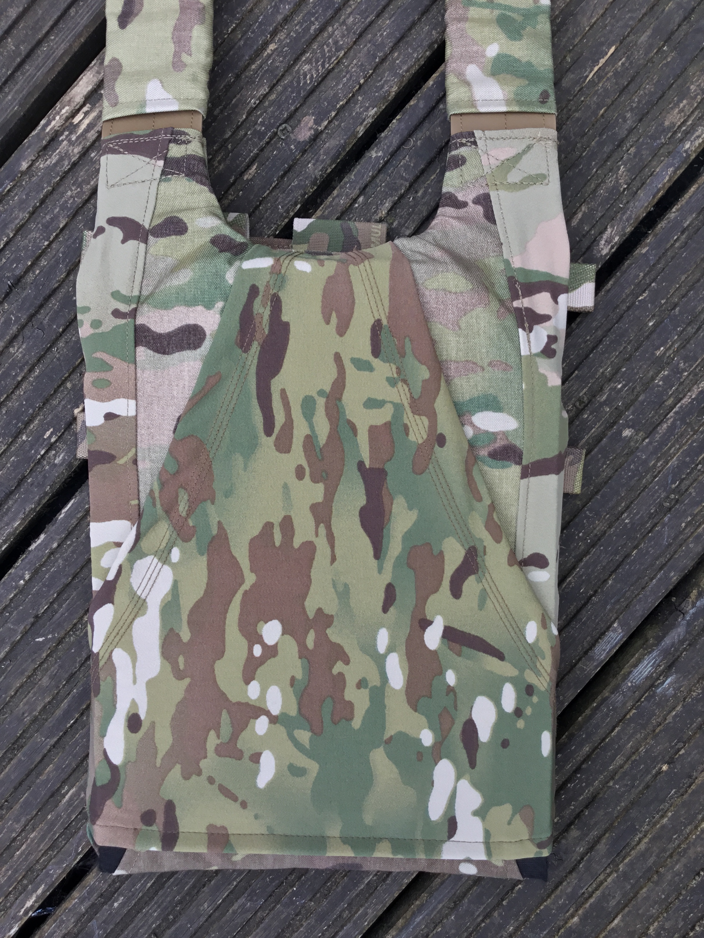 The softshell fabric is repeated at the sides of each plate bag, to provide snug but expansive fit for SAPI pattern plates: