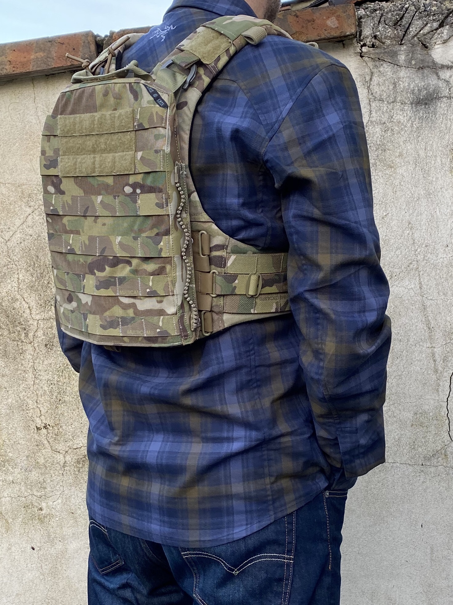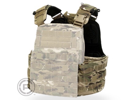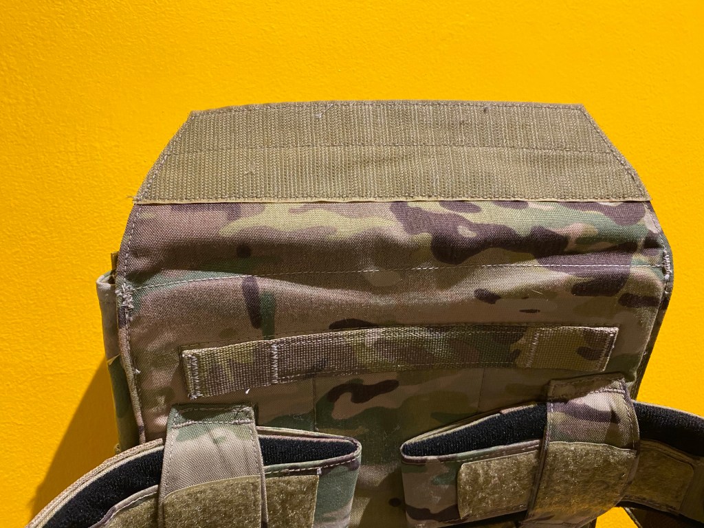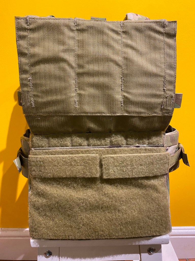 At the base of the rear plate bag is a flap which secures with velcro hook facing outwards. The flap features a webbing tab for ease of opening. Ballistic or weighted training plates are inserted here.