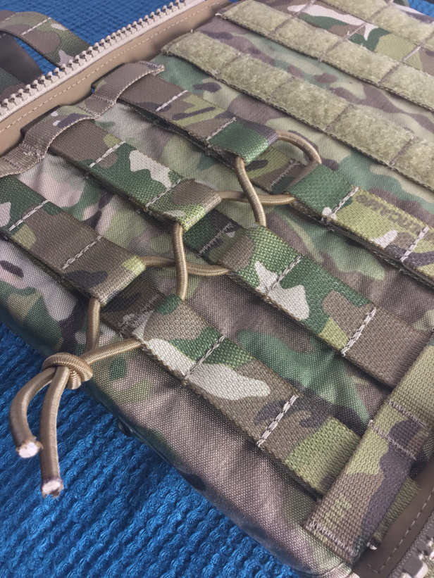 The reverse of the rear plate bag features corresponding PALS webbing, through which the stiffened straps are inserted (then secured using the poppers). The PALS allows the straps to slide freely, so that expansion and contraction of the harness is not impeded as the user moves.