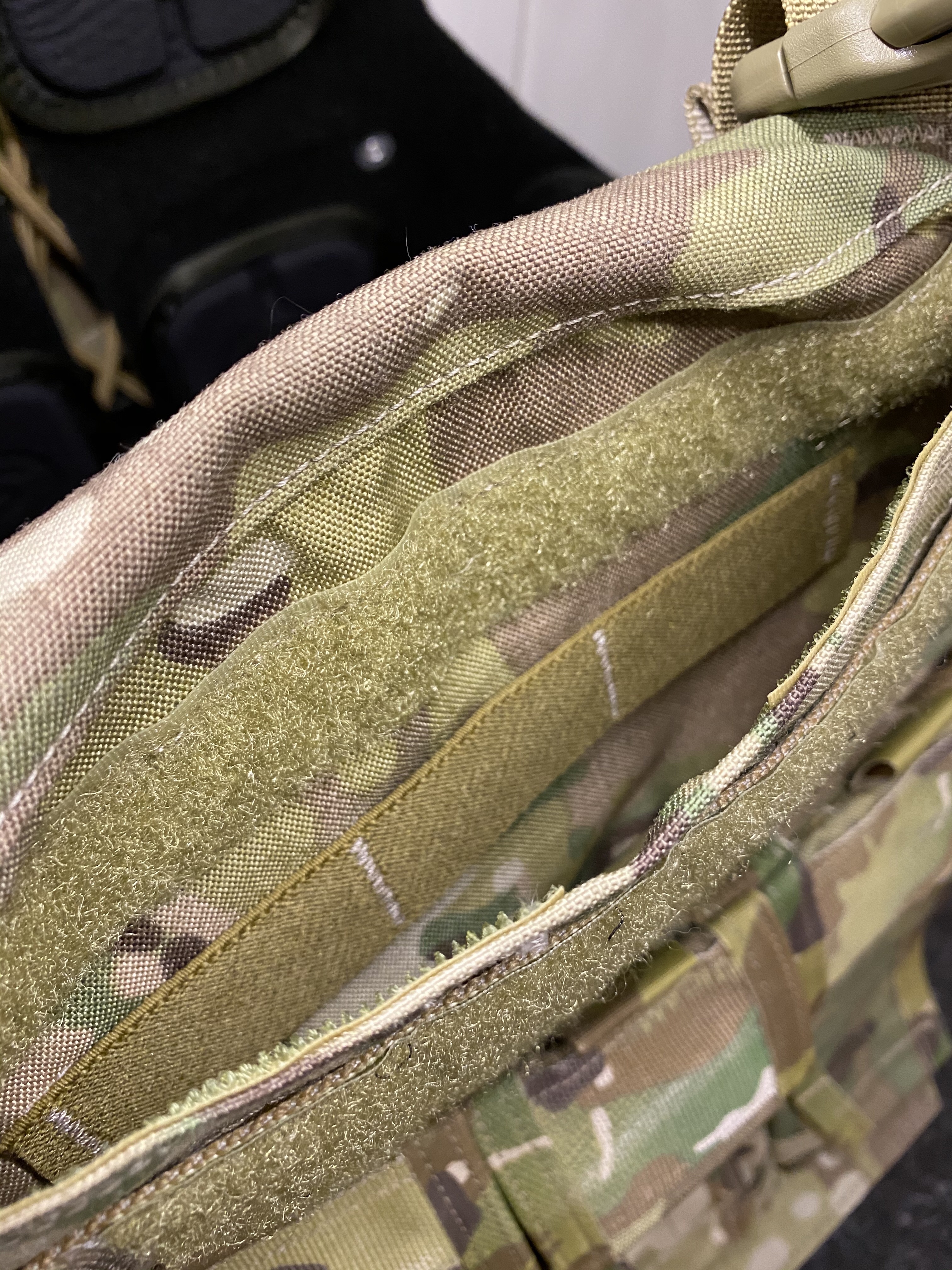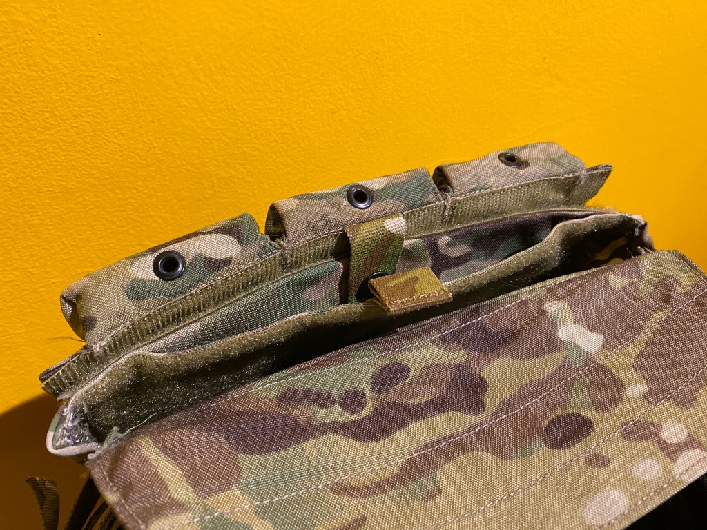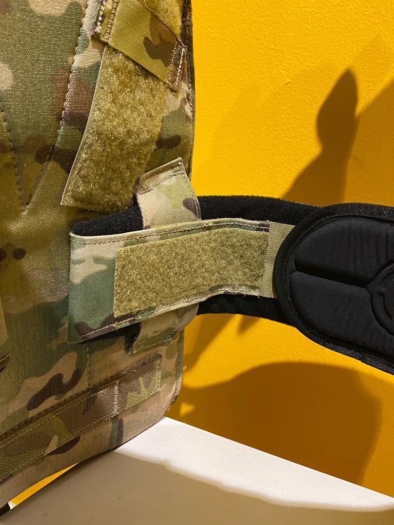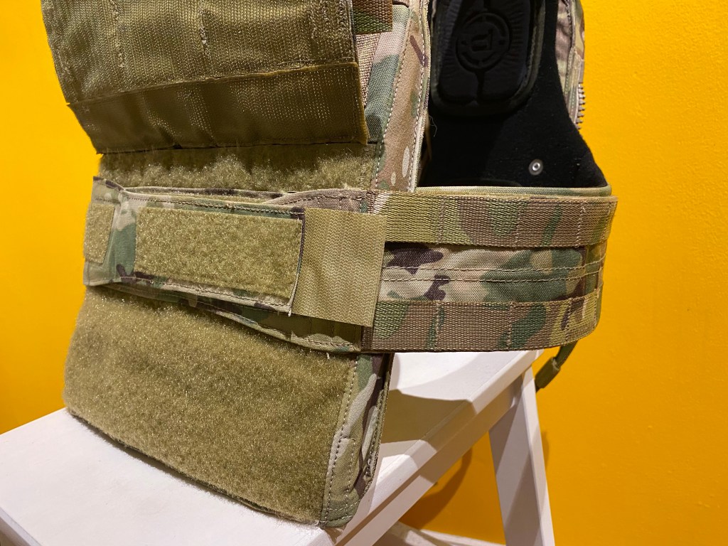 The bag’s base flap is again orientated with hook facing outwards. Ballistic or weighted training plates can be inserted within.
