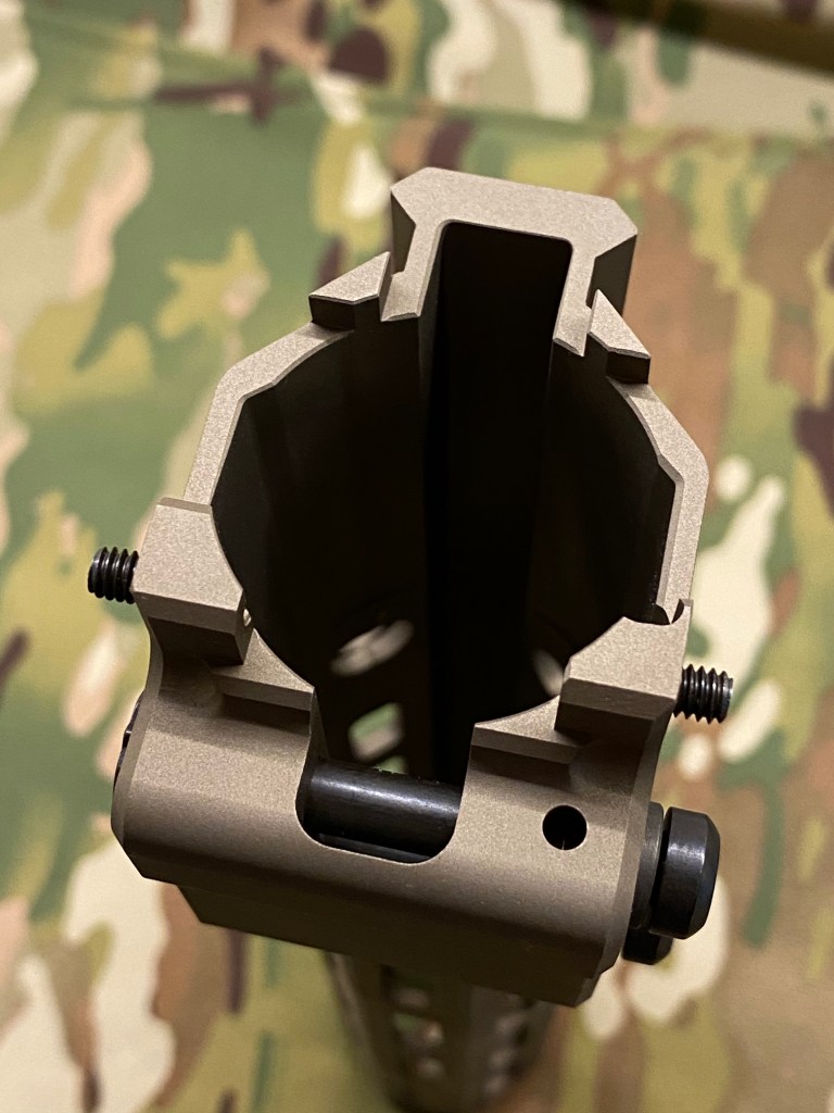 Geissele has unashamedly based this nut on the HK416 one. The holes in the radius are used for tightening (HAO sells a tool separately for this job) and the channel intersects with the front cross bolt (the rear cross bolt is dropped down below this line and is for additional security).