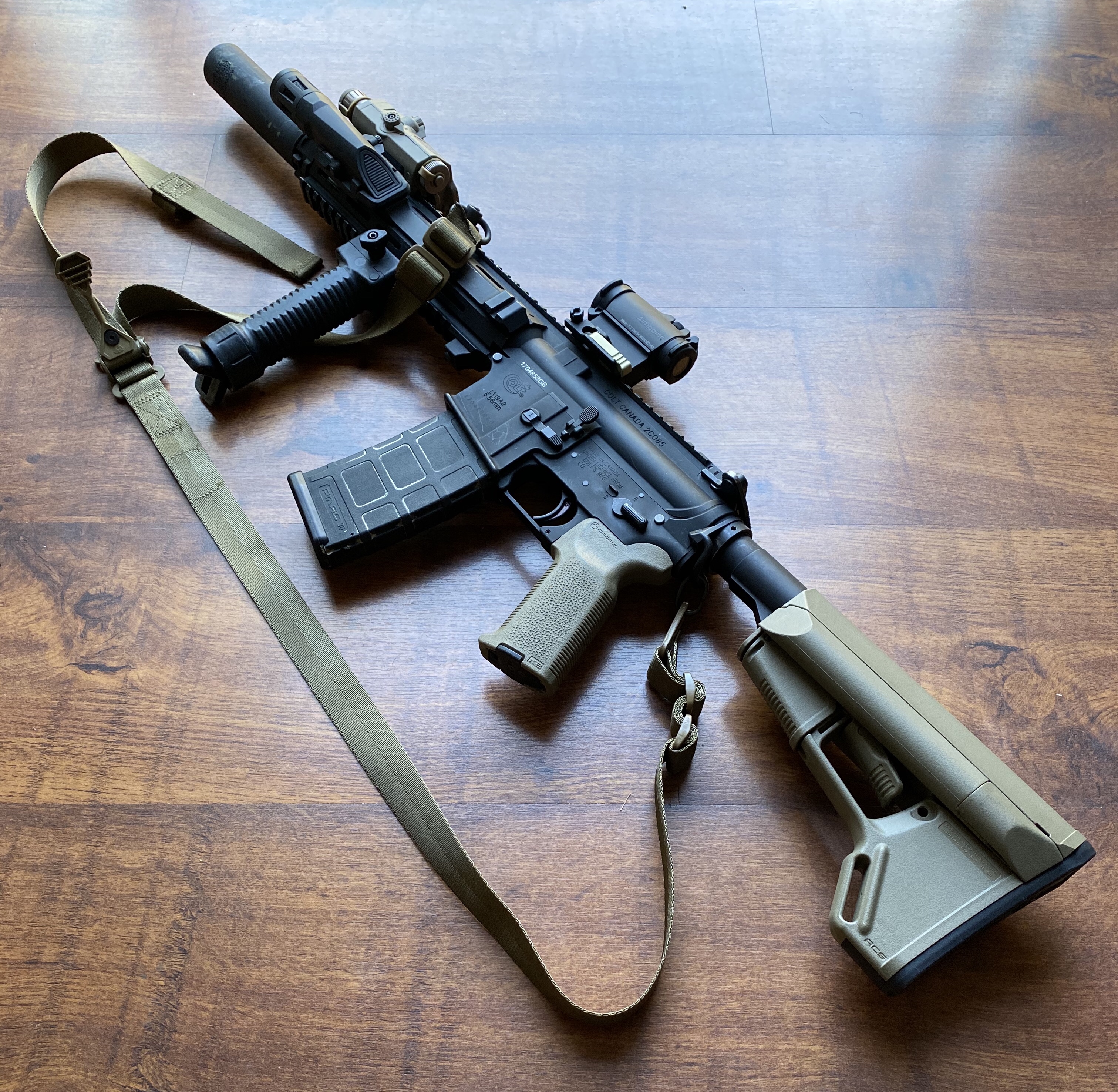Here I changed the black Grip Pod for a tan one (which is current British Army issue). The bigger change was less obvious: removing the RS Colt Canada mag catch in favour of an OEM Systema one.