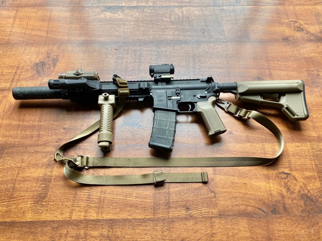 What’s occurred to me over the months is that I’ve pretty much decided on a set of core (but essentially removable) items like the RS Magpul MOE K2 grip (converted for PTW by Tackleberry), RS Aimpoint Micro T2 and mounting platform, RS Colt Canada Charging Handle (modded by Tackleberry); and Bruno’s 3D printed Surefire FA556SA replica – although I did briefly own an Airsoft Artisan can, which never made it into a formal version of my build.