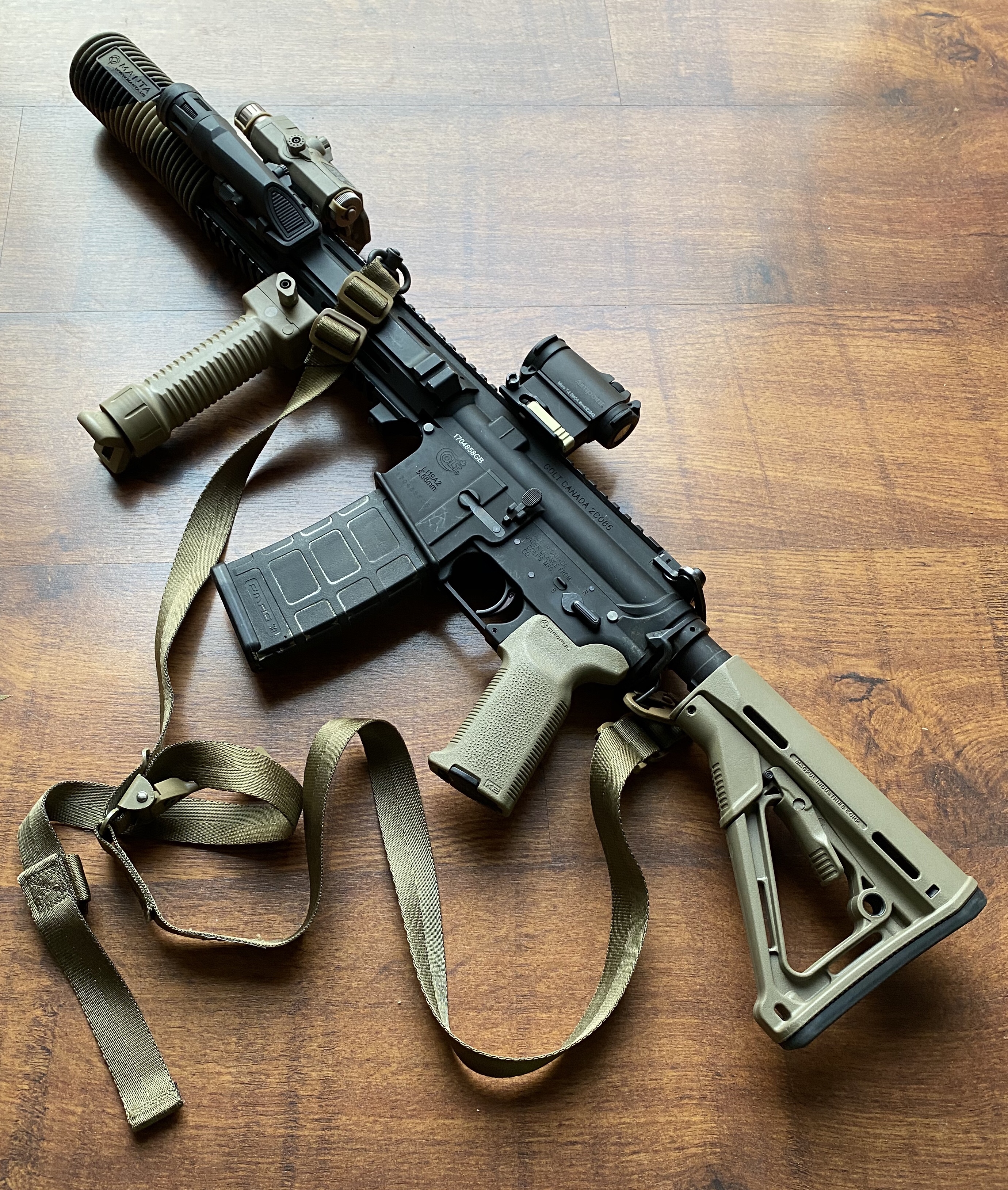 With 2.5 I retained the Manta can cover but went rather more slick at the front end; the Grip Pod removed (but not discarded) in favour of a Manta Very Low Profile rail cover. This is because I realised that I don’t always want to put my support hand in the same position, every time. It’s really dependent on what position I’m in and the cover I have available.