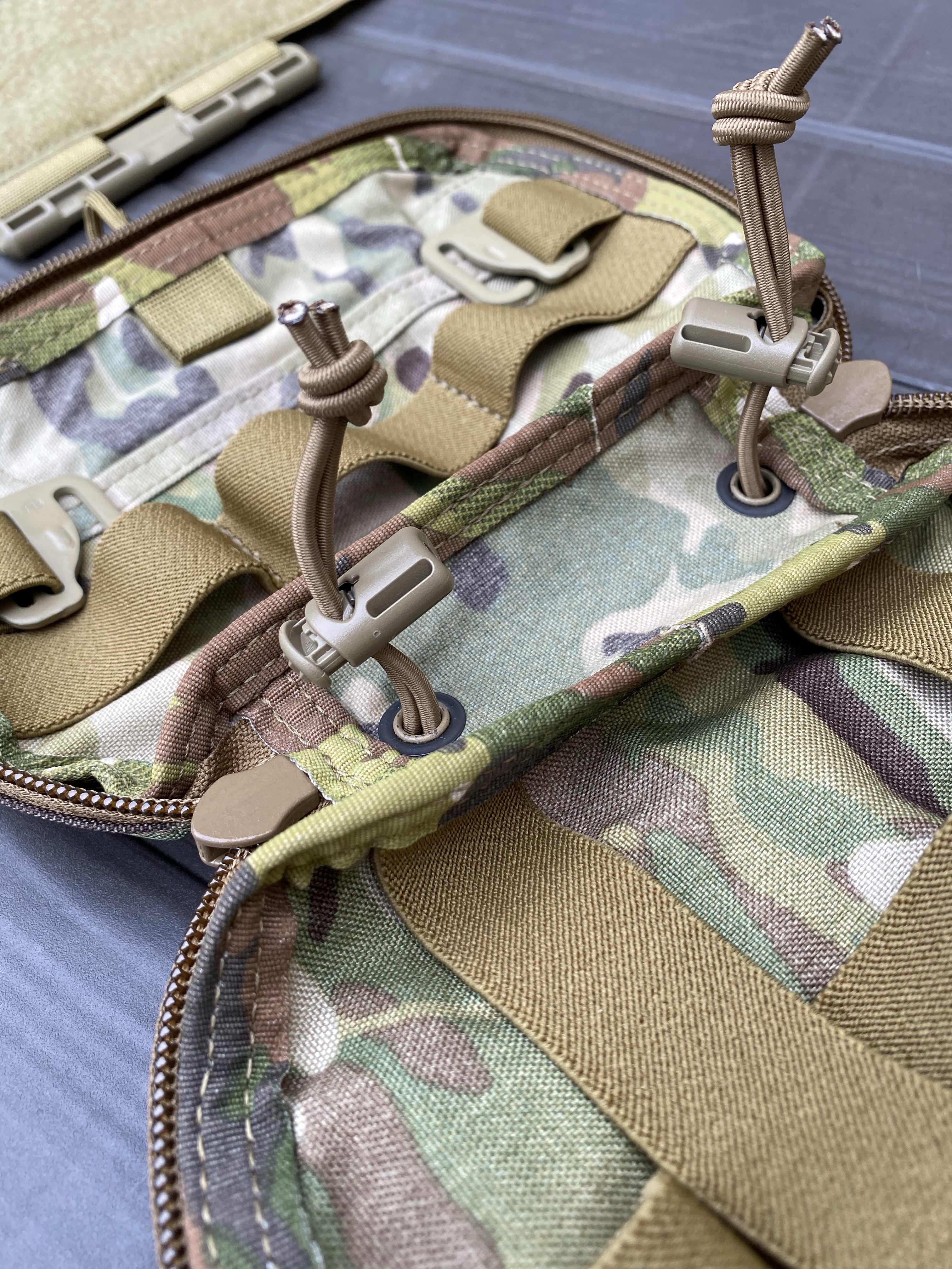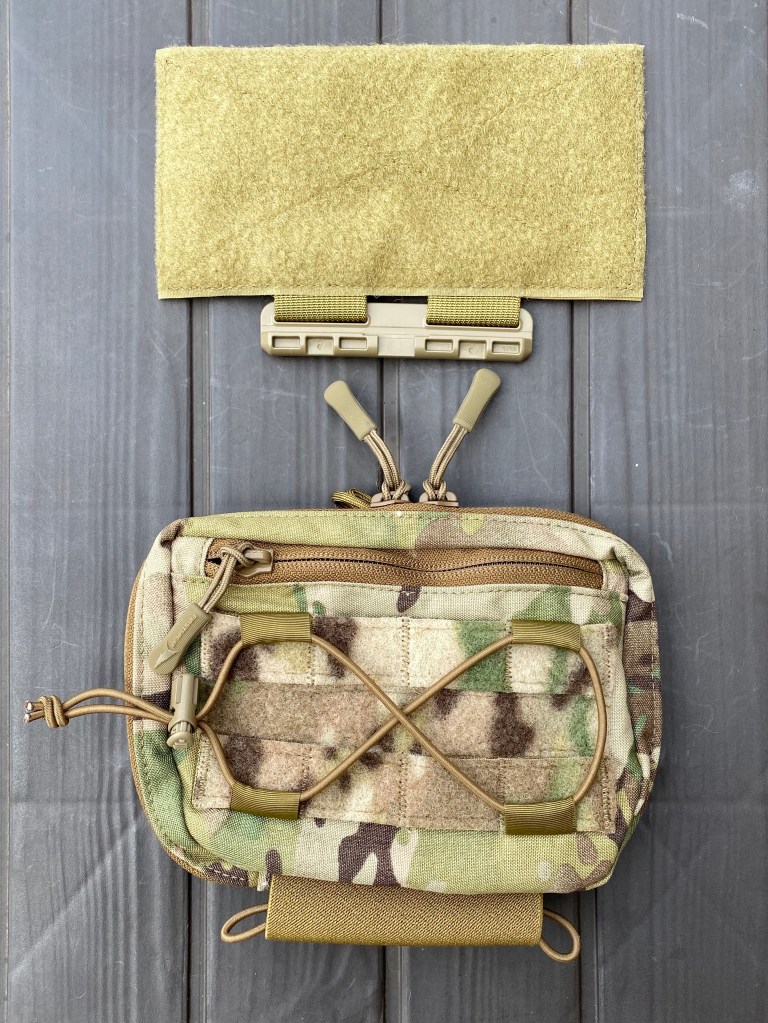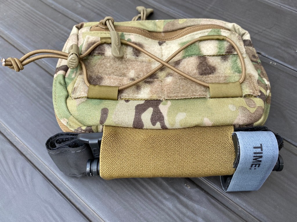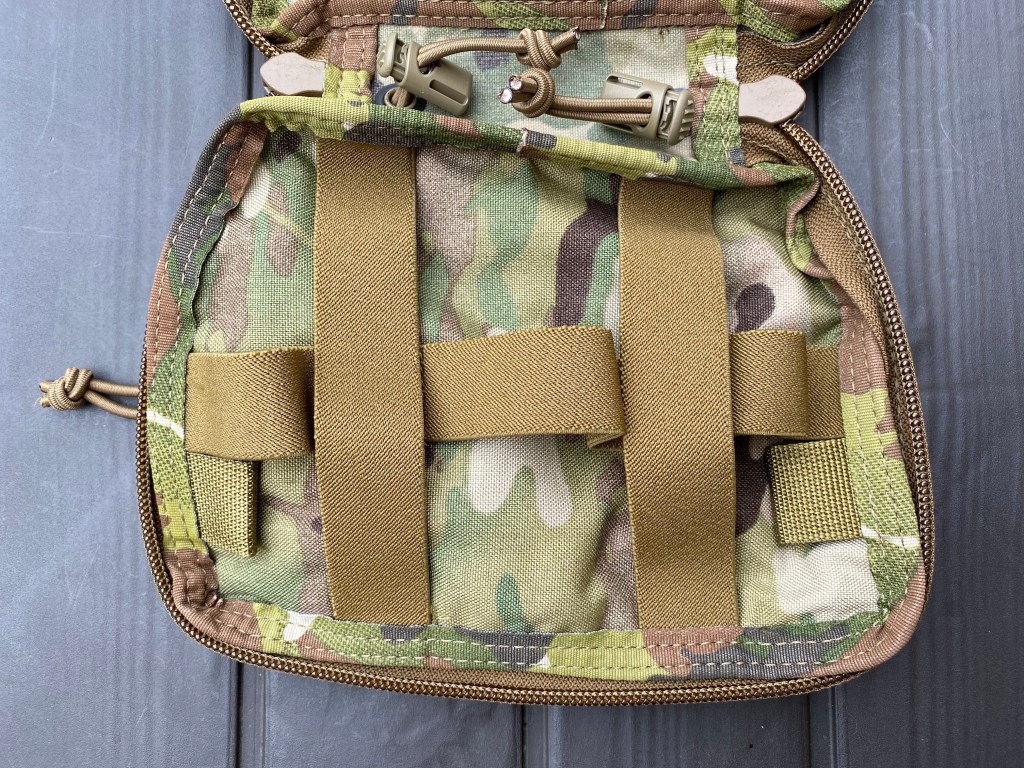 Below the lattice, on the base of the pouch, is 1. an elastic TQ garage and 2. two shock cord loops.