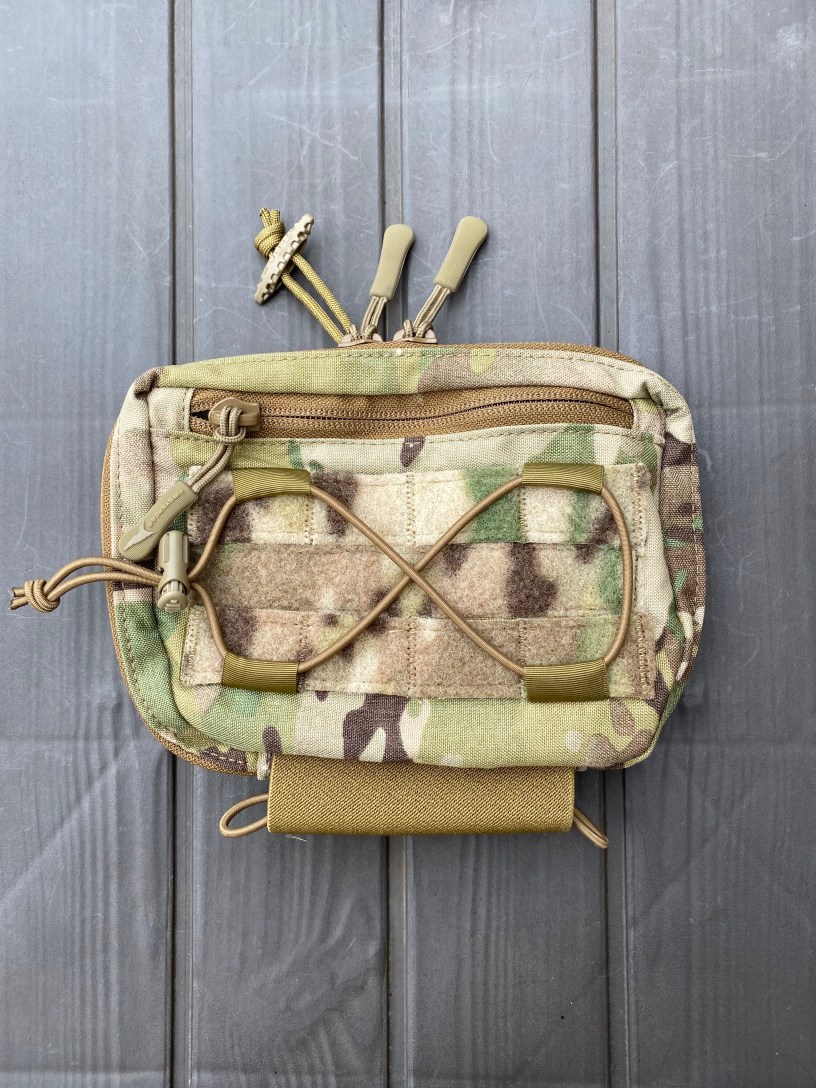 The face of The RAID Pouch exhibits a shock cord lattice which is tensioned by a cord loc. Items can be piggybacked on the pouch using this tie down system – a TQ or a water bottle, for instance.