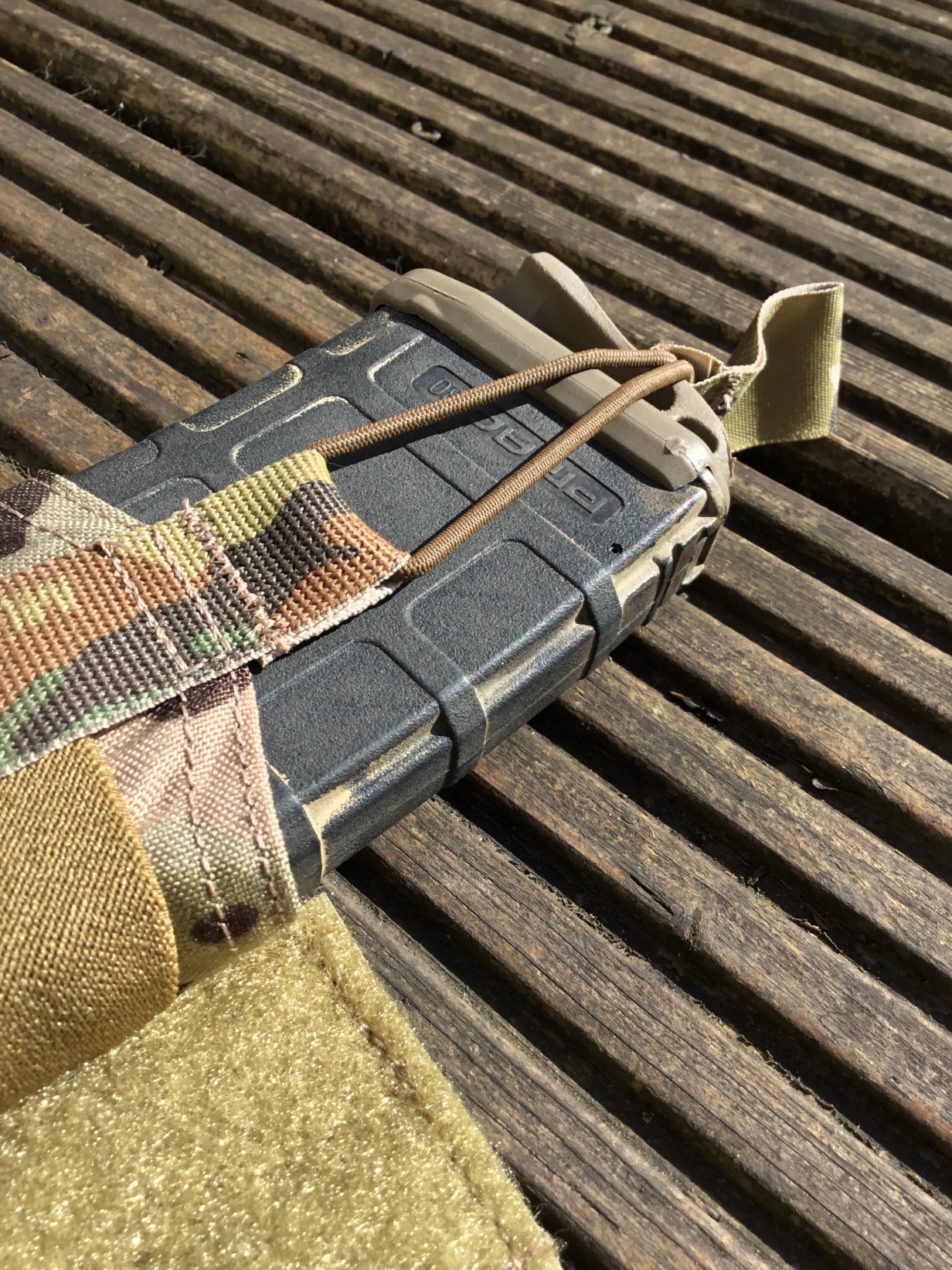Mags are retained using bungees but the pouch mouths also exhibit elastic, which makes reindexing doubly hard. This is often something that users think makes the pouch unusable.
