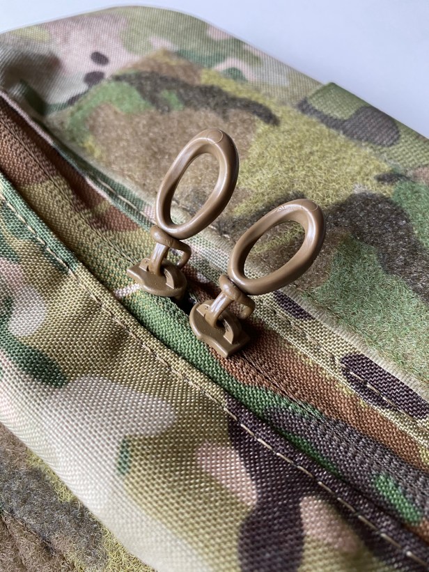 The twin zip pulls appear to be ITW GT Zip Lines and these sit nicely proud and easy to articulate when compared to simpler methods.