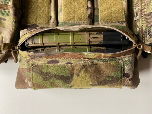 As is usual with drop pouches, the Mini Dangler makes use of the appropriate velcro surface at the rear of a chest rig, or under a PC’s front flap. Because I run an AVS Flap on my Crye AirLite Convertible Chest Rig using a custom adaptor, that’s the way I have the Mini Dangler fitted in these pictures.