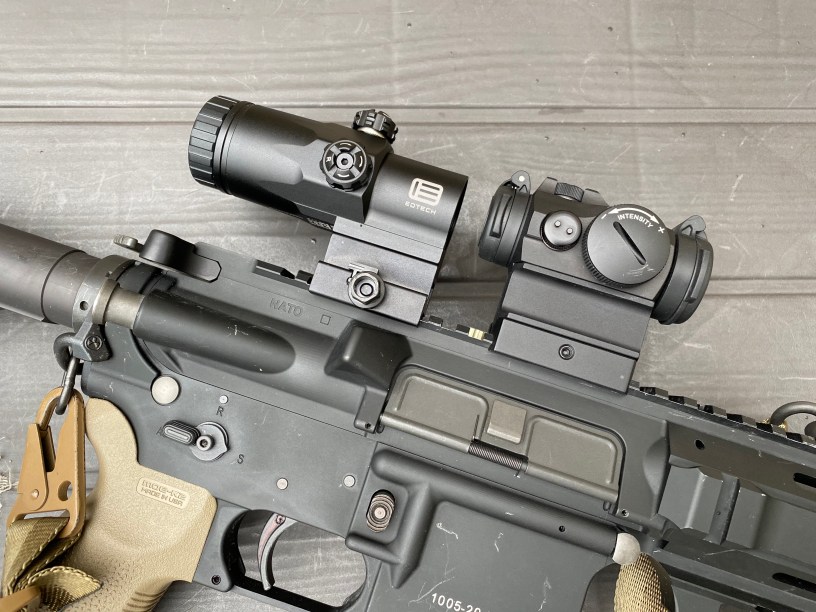 Just for reference, the G30 lines up well – physically – with my T2 on lower third mount. It’s not actually essential for the magnifier to line up perfectly with the red dot, but this is close.