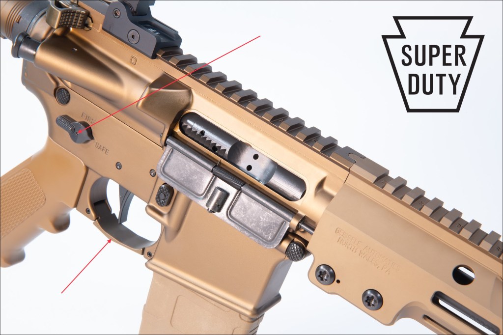 Clearly the big thing about this SOF build is that the receiver, buffer tube and trigger guard are tanodised. That’s because this appears to be based on a Geissele Super Duty Pistol.