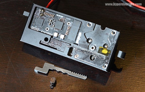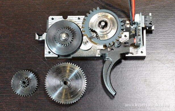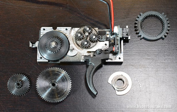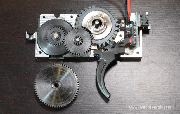 The sector gear removed. It’s a dual sector gear (DSG), which fires one BB at half normal cycle.