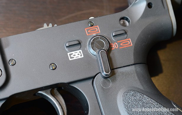 Note the plastic cap over the fire selector screw. This is an attempt to make the selectors look more normal, compared with Systema’s other INFINITY prototypes.