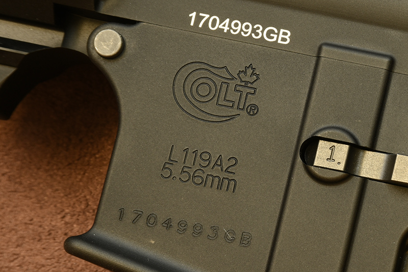 Note the deeply stamped Colt Canada trade mark, MOD designation (L119A2) and calibre (5.56mm). This all looks deeper and more even than the wildly varying depth of the PTW kit’s rolled effect which, while authentic, disappointed some kit owners who are used to uniform, neatly engraved airsoft trades. So the MWS kit gets the job done – stamped, not engraved, like the RS – but in a less visceral package, preferred by most.