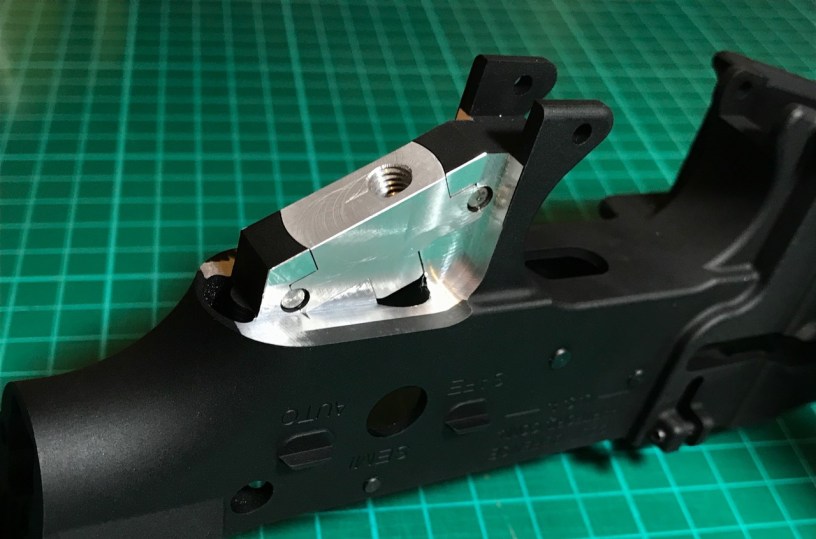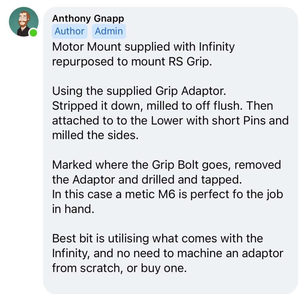 You can either use the supplied dummy motor to mount your existing Grips, or partially modify an RS Grip to fit the standard Lower (no need to hollow the rest of the Grip to fit over a Motor), or have the Receiver Milled to allow the fitment of any commercially available Grip – meaning Grips do not need any mods and bolt straight on.